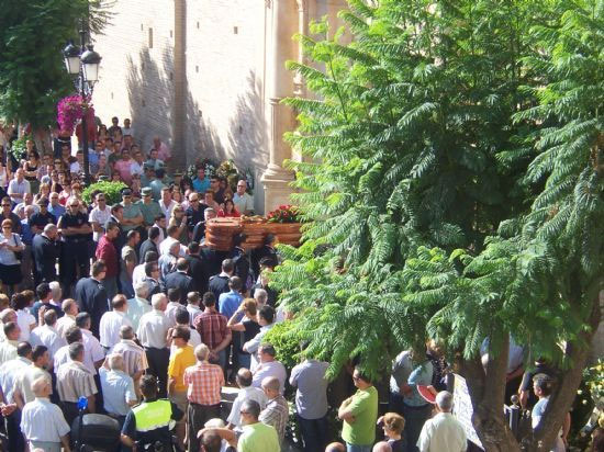 El cuerpo de Alfonso Murcia Rodríguez fue escoltado y portado a hombros hasta el templo, junto a sus familiares y amigos, por los compañeros de la plantilla policial de Totana, que asistieron ataviados con el uniforme de gala.