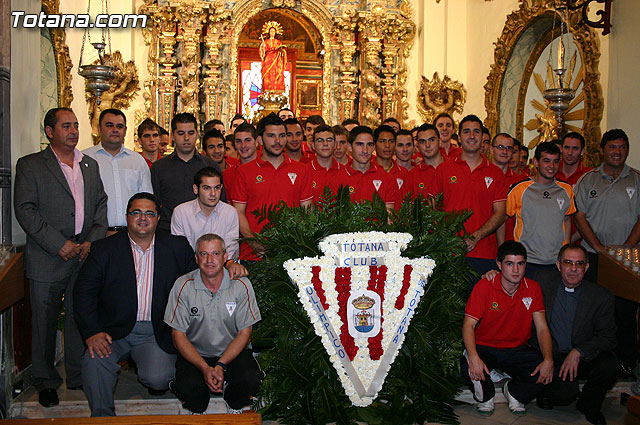 La ofrenda floral tuvo lugar el pasado sábado en el Santuario de Santa Eulalia, donde el párroco de la Iglesia Santiago, Francisco Fructuoso, el alcalde de Totana y el presidente del club rojiblanco tuvieron palabras de ánimo para toda la plantilla deseándoles un año repleto de éxitos, y posteriormente, la plantilla del Olímpico procedió a realizar la ofrenda a la Patrona.