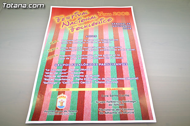A continuación, a las nueve de la noche se procederá a la inauguración del Festival Folklórico de Totana 2008, cuya entrada es gratuita, y que contará con la actuación del Folklórico “Villa de Alhama” (Murcia); el grupo Raíces Huertanas de la Peña “El Pimiento de Nonduermas-Murcia”; el grupo folklórico “La Candelaria de Beniel”; el grupo folklórico “Aires del Júcar de Villagordo”, del Júcar, el grupo folklórico de Vélez-Blanco-Almería”; y los grupos anfitriones, el coro “Santa Cecilia” y el grupo “Santiago”.