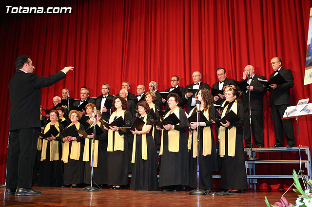 El alcalde de Totana, José Martínez Andreo, acompañado por la concejal de Artesanía, Isabel María Sánchez Ruiz, y por el concejal de Educación, Roque Molina Legaz, agradeció la labor desempeñada por la coral durante estos 25 años, ya que se ha convertido en un referente de la música totanera.