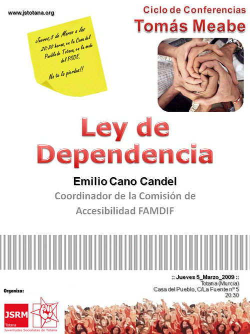 Juventudes Socialistas de Totana organiza, hoy Jueves 5 de Marzo a las 20:30, en la Casa del Pueblo, sede del PSOE, una charla sobre la Ley de Dependencia. La finalidad de esta charla es dar a conocer la nueva normativa que tiene como beneficiarias a las personas dependientes.