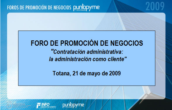El “Foro de Promoción de Negocio”, que se ha organizado con motivo de la nueva Ley de Contratación Administrativa, que afecta a aquellas empresas que trabajan o quieren trabajar para las distintas administraciones, es una iniciativa de la Red Punto-Pyme y el Instituto de Fomento de la Región de Murcia, se organiza en colaboración con diversas organizaciones empresariales y sociales, con el fin de continuar estimulando la creación de empresas y la promoción de las oportunidades de negocio.