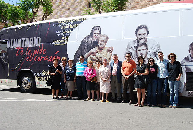 El alcalde de Totana, José Martínez Andreo, el director General de Inmigración y Voluntariado, Leopoldo Navarro Quílez, y el concejal de Participación Ciudadana y Voluntariado, Juan Carrión, han visitado esta mañana el Bus del Voluntariado, que comenzó su recorrido por la Región el pasado día 15 de mayo, y que hoy se encuentra en Totana.