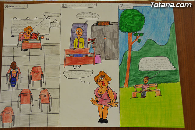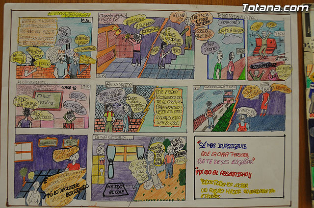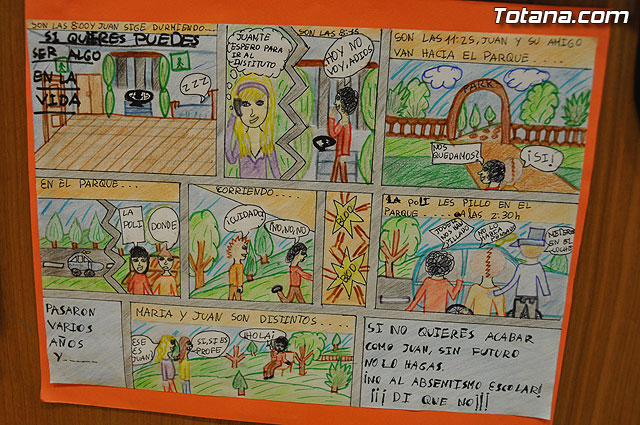 El cómic ganador del primer premio del concurso, realizado por José Manuel Segura Imbernón del Colegio “Reina Sofía”, bajo el lema “Si en un futuro quieres trabajar, ve al colegio, que hay que estudiar”, nos narra la historia de dos niños con futuro diferente. Uno de ellos va a clase todos los días, y aunque tiene algún que otro problema con alguno de sus compañeros, es un chico responsable y es consciente de la importancia que tiene la educación para su futuro. El otro niño de la historia sin embargo decide no ir al colegio, no enfrentarse a los problemas que tiene y disfrutar del momento presente sin recapacitar en ningún momento en su futuro. Pasado el tiempo, el chico que terminó sus estudios es un abogado defensor de los derechos y las libertades de la gente, y el chico que decidió no asistir a clase y no terminar sus estudios se encuentra en paro y su futuro es incierto.
