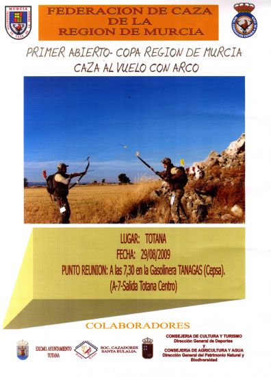 La Federación de Caza de la Región de Murcia, en colaboración con el Club de Cazadores “Santa Eulalia” y el Ayuntamiento de Totana, celebrará este sábado 29 de agosto en el paraje de “Las Cabras” el Primer abierto Copa Región de Murcia de Caza al Vuelo con Arco.