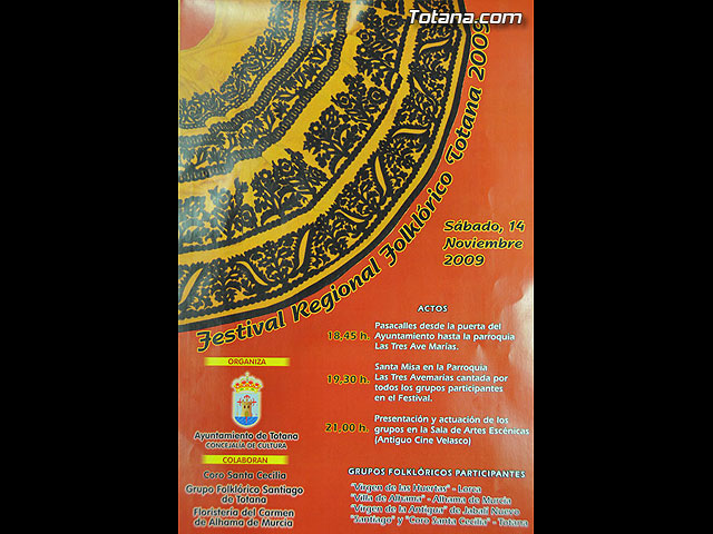 A continuación, a las nueve de la noche se procederá a la inauguración del Festival Folklórico de Totana 2009, cuya entrada es gratuita, y que contará con la actuación del grupo folklórico “Villa de Alhama”; el grupo “Virgen de las Huertas” de Lorca ; el grupo folklórico “La Antigua” de Jabalí Nuevo; y la actuación conjunta de los grupos anfitriones, el coro “Santa Cecilia” y el grupo “Santiago”.