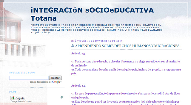 La Concejalía de Bienestar Social ha creado un blog educativo, que se enmarca dentro del “Proyecto de inserción socioeducativa de jóvenes y menores inmigrantes en situación o riesgo de exclusión social”, subvencionado por el Ministerio de Trabajo e Inmigración y el Ayuntamiento de Totana.