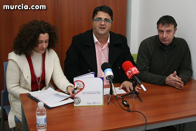 El delegado de FEDER en Murcia, Juan Carrión Tudela y la psicóloga de la asociación D’Genes, Ana García, han presentado en la sede de la asociación la guía promovida por FEDER en colaboración con Merck Serono que pretende ofrecer herramientas de intervención con familias y afectados.