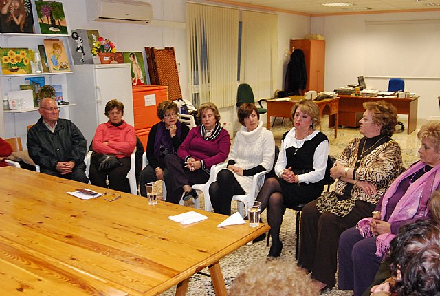 La concejal de Mujer e Igualadad de Oportunidades, Josefa María Sánchez, y la que era directora general del Instituto Murciano de Acción Social, Marisol Morente, asistieron a la charla sobre la situación actual de las ama de casa, organizada por la Asociación de Amas de Casa, Consumidores, y Usuarios “Las Tres Ave María” de Totana, dentro del programa de actividades organizado para conmemorar el Día Internacional de la Mujer.