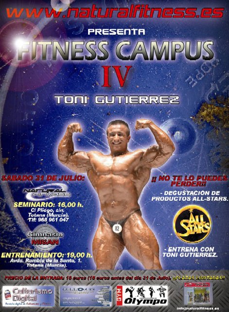 El gran culturista español Toni Gutiérrez, uno de los competidores españoles más masivos de nuestra geografía, impartirá el próximo Sábado día 31 de Julio en Totana, Murcia (España), un Campus Training que constará de un apartado de teórico y otro práctico en el que los asistentes que lo deseen podrán tomar parte.
