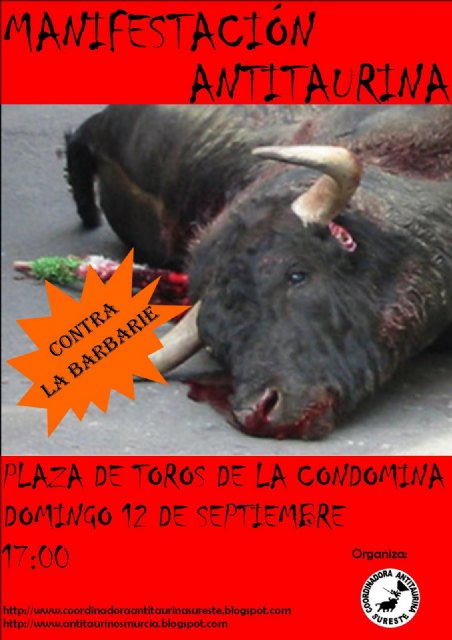 "6 toros 6 serán torturados y asesinados ese día por tres "prestigiosos" verdugos: Jesulín de Ubrique, Manuel Díaz “el Cordobés” y Francisco Rivera Ordóñez", aseguran desde las Juventudes Comunistas de Totana. "Durante la Feria de Septiembre de Murcia, en once días, un total de 66 animales serán torturados hasta la muerte".