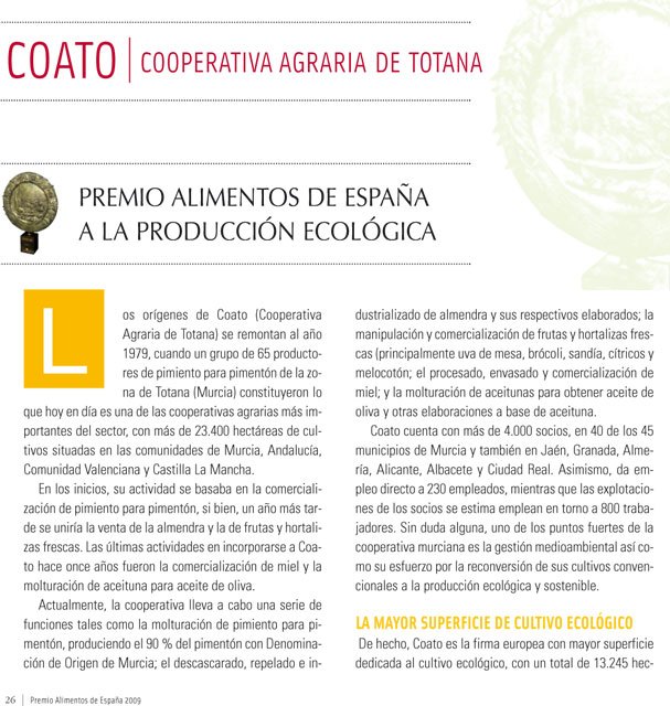 En esta edición, los 12 galardonados representan las siguientes categorías: “Producción Agraria”, “Restauración”, “Producción Ecológica” (que recayó en COATO, de Totana), “Sector Consumidor”, “Comunicación”, “Industria Alimentaria”, “Distribución y Comercio Alimentario”, “Joven Empresariado”, “Mujer Emprendedora”, “Mejor Aceite de Oliva Virgen Extra Español de la campaña 2008-09”, “Mejor Queso Español” y un “Premio Extraordinario Alimentos de España”.