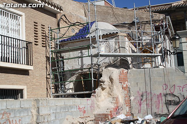 Bedia ha explicado que se ha saneado la fachada, se ha recalzado el pilar, se procederá a la sustitución de las vigas de madera, se impermeabilizará el suelo entre otras cosas. Además ha indicado que se ha conseguido restaurar la bóveda original en la que se está colocando una teja de color azul vivo.