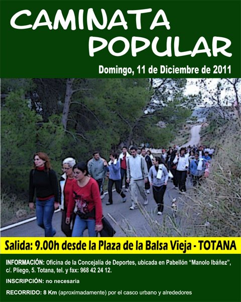 La Concejalía de Deportes informa que la Caminata Popular se celebrará este domingo, día 11 de diciembre, a partir de las 9 horas, desde la plaza Balsa Vieja, con un recorrido de 9 kilómetros aproximadamente que transcurrirán por el casco urbano y la zona de Los Huertos, y estará dirigida por el monitor de la Concejalía Alfonso Adán.