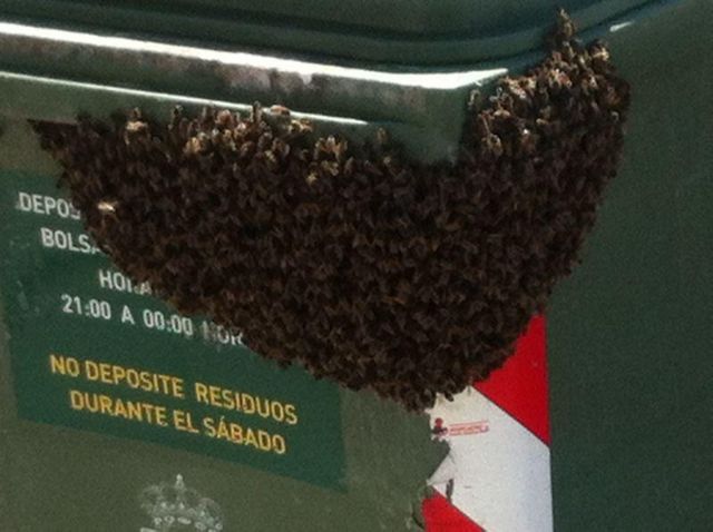 Protección Civil de Totana retiró ayer un enjambre que se encontraba ubicado en un contenedor de residuos sólidos urbanos de la calle Virgen de Montserrat, en las inmediaciones del colegio público Santa Eulalia y el cuartel de la Guardia Civil; y que estaba ocasionando molestias a los vecinos de la zona.