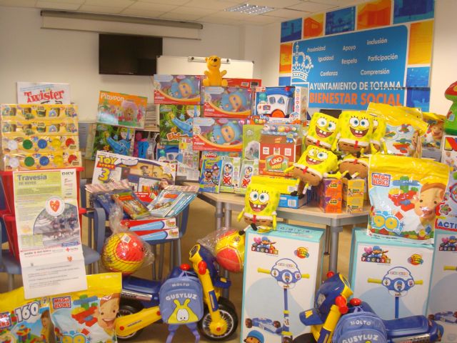 Cruz Roja Española y el Ayuntamiento de Totana reparten más de 140 juguetes a niños de la localidad cuyas familias atraviesan una situación de necesidad. Este reparto ha sido posible a través de lo recaudado en Totana en la campaña "Travesía de Reyes" organizada por Cruz Roja y que ha consistido en una travesía solidaria de tres días de duración por etapas de asfalto y montaña con un total de 240 Km, que atravesó 25 municipios de la Región de Murcia para ayudar a los niños y a las familias con dificultades económicas y exclusión social, siendo uno de ellos el municipio de Totana.