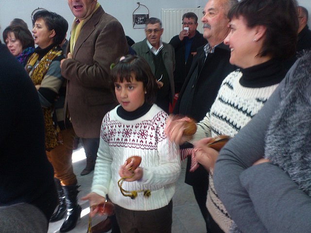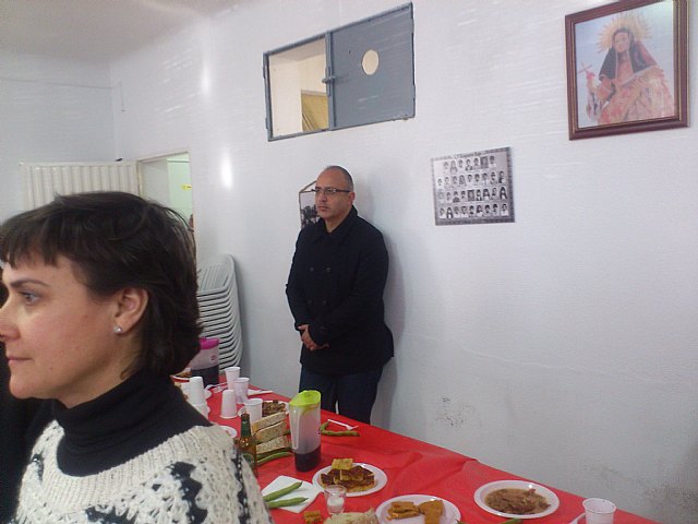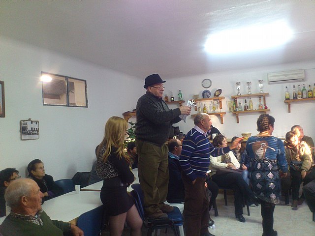 Después los vecinos se trasladaron al local social en el que se llevo a cabo un almuerzo para todos los asistentes compuesto de habas, salado, tortas de pimiento molido, crespillos, michirones, patatas con ajo, etc. Más tarde se comenzó “El cante de ánimas” que consiste en que el “Inocente” (Pepe Salas) te toca con la caña, y el vecino paga lo que desee y el dinero es mostrado al “Guión” (José Antonio Muñoz) el cual le dedica unas coplas al vecino y a su familia, y en el caso de que tenga difuntos pide por ellos. Le pide a la Virgen salud y al Santo la bendición.