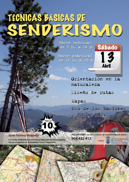 La Concejalía de Deportes ha organizado para el sábado 13 de abril una jornada sobre "Técnicas Básicas de Senderismo", la cual será dirigida por Javier Ramírez Melgarejo, educador ambiental en el Parque Regional de Sierra Espuña y técnico en actividades físico deportivas.