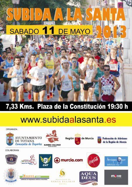 La XVII Subida a La Santa de Totana se celebrará este próximo sábado día 11 de mayo, a partir de las 19:30 horas, desde la plaza de la Constitución, con un recorrido de 7,33 kilómetros, prueba puntuable en el calendario de la Liga de Carreras Populares "Running Challenge" de la Región de Murcia; y cuyas inscripciones se pueden realizar hasta el 8 de mayo, a las 20:00 horas.
