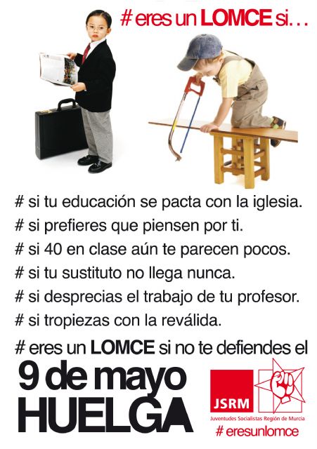 Juventudes Socialistas de Totana (JST) lanza hoy una campaña de difusión por centros de la localidad para pedir la retirada de la LOMCE, ya que consideran que segregar a los estudiantes en las aulas mediante las reválidas que plantea la reforma es inmoral y rompe por completo la equidad en la educación.