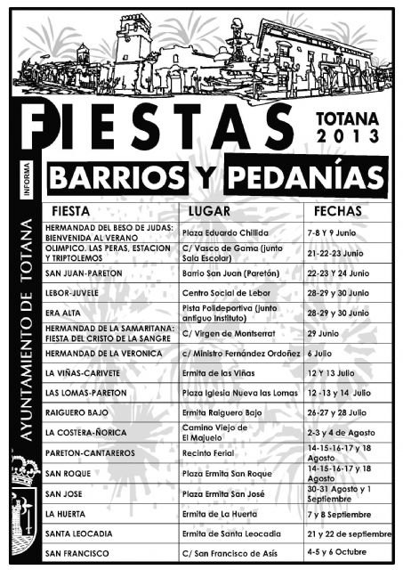 La Concejalía de Festejos ha cerrado el calendario de fiestas en los barrios y pedanías de Totana para este verano 2013, que se prolongarán desde los mes de junio a octubre, y que comenzará el fin de semana del 7 al 9 de junio con la fiesta que la Hermandad del Beso de Judas “Bienvenida al verano”, que tendrá lugar en la plaza Eduardo Chillida.