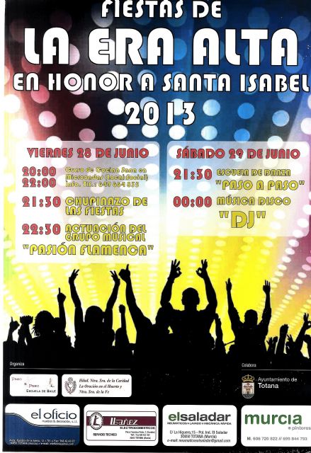 Las fiestas en el barrio de la Era Alta de Totana en honor a Santa Isabel se celebran este próximo fin de semana del 28 y 29 de junio, y están organizadas por la Hermandad de Nuestra Señora de la Caridad, la Oración en el Huerto y Nuestra Señora de la Fe y la Escuela de baile "Paso a Paso" de esta localidad.