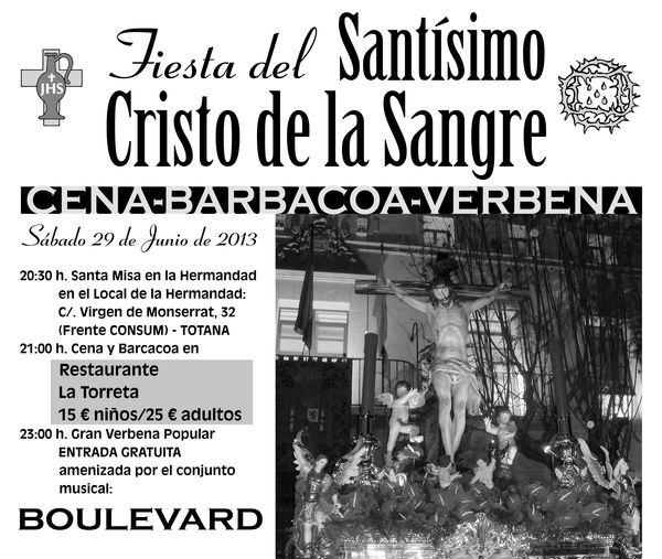 Posteriormente, a las 21:30 tendrá lugar una Cena-barbacoa en el restaurante La Torreta de Totana y luego una verbena-fiesta amenizada por el conjunto Boulevard.