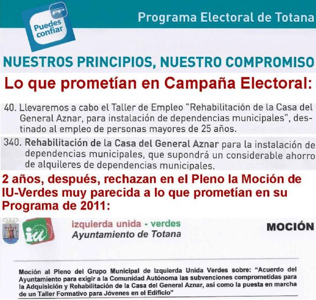 "Se da la circunstancia añadida que la propuesta de IU-Verdes, coincidía en su totalidad con los puntos 40 y 140 del Programa Electoral del PP en Totana, cuando en 2011 prometían a los totaneros que "Rehabilitarían la Casa del General Aznar y utilizarían un Taller de Empleo para formar a trabajadores en paro". Promesas, que ahora niegan, de forma antidemocrática, ante la iniciativa de los concejales de IU-Verdes", añade el comunicado.