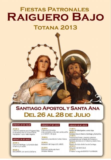 Las fiestas patronales de El Raiguero Bajo se celebrarán del 26 al 28 de julio en honor a Santiago Apóstol y Santa Ana, si bien este próximo sábado día 20 de julio se celebrará, a partir de 20:00 horas, la II Marcha Nocturna por la diputación, cuyo encuentro será en el local social de la pedanía y tiene un precio de inscripción de un euro.