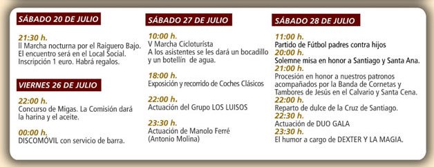 Asimismo, el domingo día 28 de julio, a las 11:00 horas, se disputará el partido fútbol de fútbol de padres contra hijos; y a las 20:00 horas misa en honor a los patrones de la pedanía, Santiago Apóstol y Santa Ana. A las 21:00 horas se celebrará la procesión con la banda de cornetas y tambores de Jesús en el Calvario y Santa Cena.