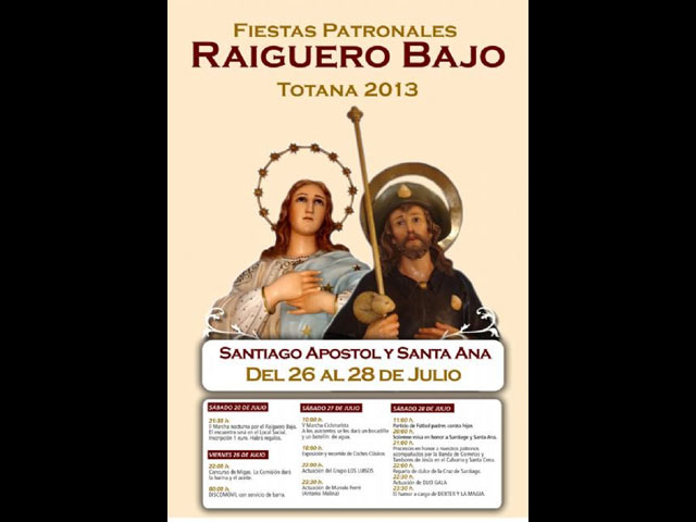 Las fiestas patronales de El Raiguero Bajo se celebrarán del 26 al 28 de julio en honor a Santiago Apóstol y Santa Ana, si bien el pasado sábado 20 de julio se celebró la II Marcha Nocturna por la diputación.