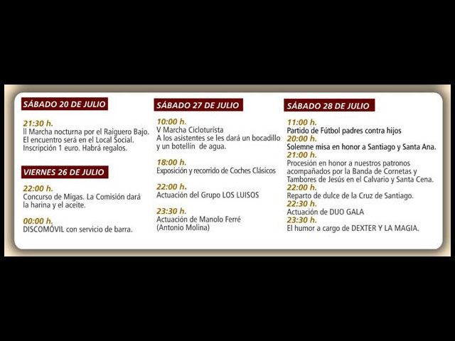 Asimismo, el domingo día 28 de julio, a las 11:00 horas, se disputará el partido fútbol de fútbol de padres contra hijos; y a las 20:00 horas misa en honor a los patrones de la pedanía, Santiago Apóstol y Santa Ana. A las 21:00 horas se celebrará la procesión con la banda de cornetas y tambores de la Hermandad de Jesús en el Calvario y Santa Cena.