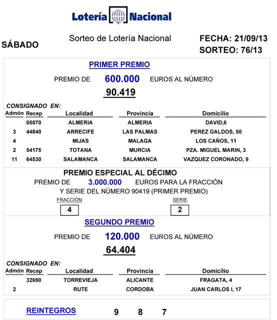 Según el Organismo Nacional de Loterías y Apuestas del Estado, el premio especial al décimo, dotado con 3 millones de euros, ha recaído en la fracción 4 de la serie 2 del primer premio -90.419-.