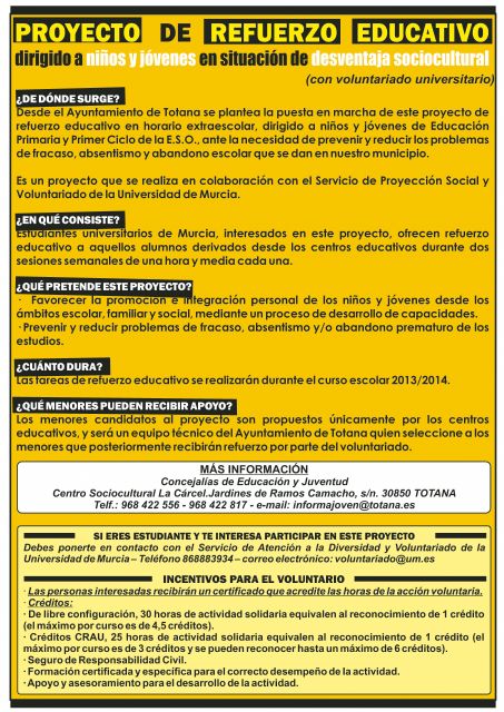 Las Concejalías de Juventud y Educación volverán, un año más, a poner en marcha para este curso académico 2013/2014 el proyecto de Refuerzo Educativo en Totana, que va dirigido a niños y jóvenes en situación de desventaja sociocultural; y que prevé la colaboración de estudiantes universitarios, que a cambio de créditos universitarios, vienen desarrollando una tarea de voluntariado durante el curso escolar.