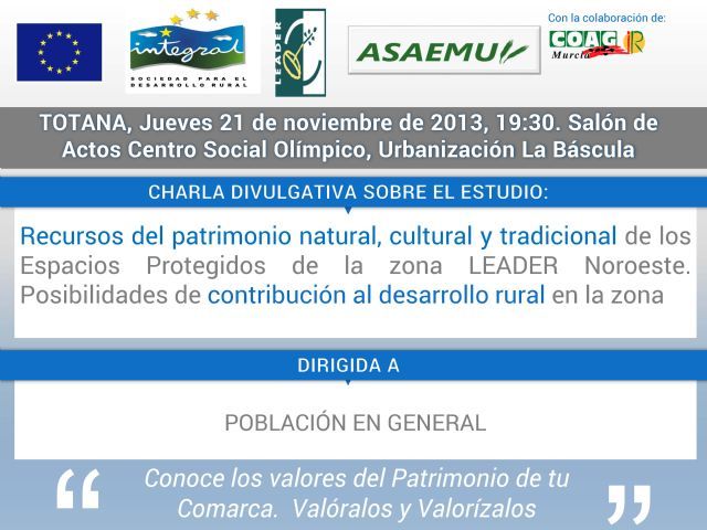 La Asociación Agraria de Servicios de Asesoramiento de Explotaciones Agrícolas y Ganaderas de la Región de Murcia (ASAEMU), entidad sin ánimo de lucro vinculada a COAG-IR Murcia, ha venido realizando en los últimos meses, un proyecto de estudio para la "Catalogación y Valorización de los Recursos Patrimoniales de los Espacios con Protección Ambiental del territorio Leader "Noroeste" y la determinación de sus posibilidades para la contribución al desarrollo sostenible de la zona.