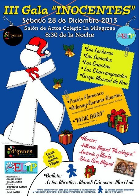 La Asociación de Enfermedades Raras de Totana, D’Genes y la Federación Española de Lipodistrofias, AELIP, organizan un año más la III Gala Inocentes, que posibilitará que diferentes artistas, grupos de música, de baila y danza de Totana y de la Región, puedan a través de este acto colaborar con los principales propósitos de ambas entidades. La III Edición se realizará hoy día 28 de Diciembre en el Salón de Actos del Colegio La Milagrosa de Totana a partir de las 20:30 horas.