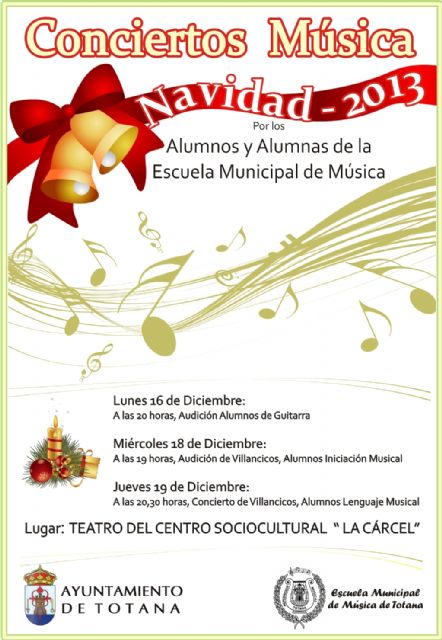 El Centro Sociocultural de "La Cárcel" acoge los conciertos de música "Navidad 2013" de la Escuela Municipal de Música que arrancan esta tarde con la audición de los alumnos de guitarra a las 20:00 horas. El miércoles 18 de diciembre a las 19:00 horas se celebrará la audición de villancicos a cargo de los alumnos de iniciación musical.