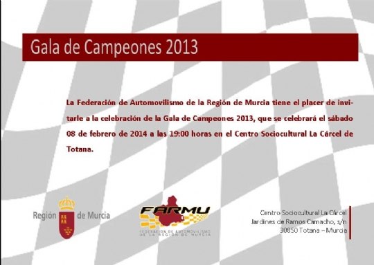 Una temporada más, la Federación de Automovilismo de la Región de Murcia celebrará la tradicional Gala de Campeones, en la que se hará entrega de los trofeos de campeones a los mejores pilotos y deportistas de los diferentes certámenes regionales.