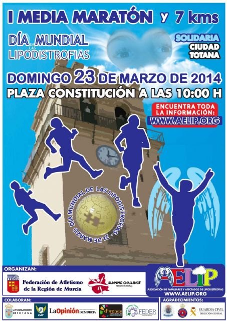 Totana celebrará el domingo, día 23 de marzo, la I Media Maratón "Ciudad de Totana", a partir de las 10:00 horas, organizada por la Federación Murciana de Atletismo y la Asociación de Familiares y Afectados por Lipodistrofias (AELIP), en colaboración con el Ayuntamiento y el Club de Atletismo de esta localidad, cuyo itinerario se realizará dando tres vueltas de siete kilómetros, hasta completar los 21 kilómetros y 97 metros que contempla la prueba.