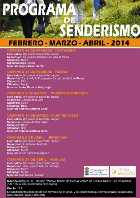 La Concejalía de Deportes ha confeccionado un nuevo Programa de Senderismo para el próximo trimestre con seis salidas dominicales durante distintos fines de semana de los meses de febrero, marzo y abril, cuyas inscripciones se pueden realizar en el Pabellón de Deportes "Manolo Ibáñez", de lunes a viernes, de 8:30 a 13:30 horas y de 16 a 19 horas, al precio de diez euros.