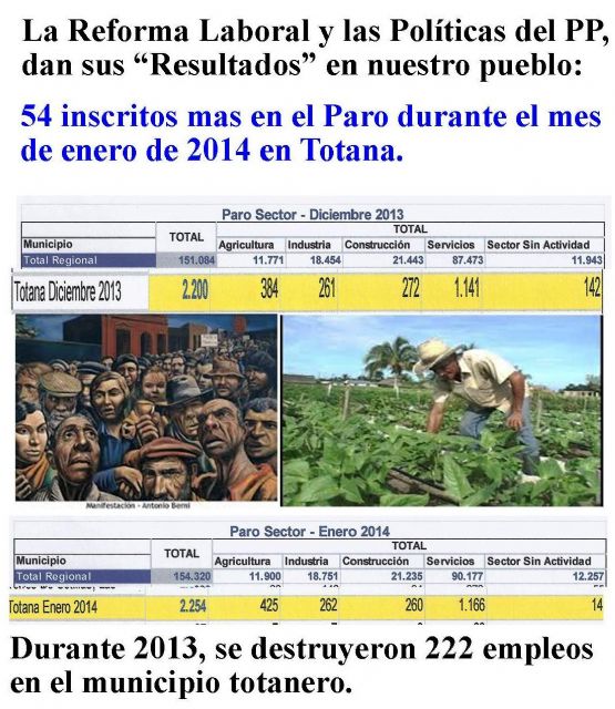 "Los resultados no pueden ser más evidentes: en enero, creció el Paro en Totana en 54 personas y los la población activa, de alta en Seguridad Social, se redujo en 222 trabajadores en 2013, según datos oficiales del SEF y la Seguridad Social…", manifiesta el Portavoz de IU-Verdes en Totana, Juan José Cánovas.