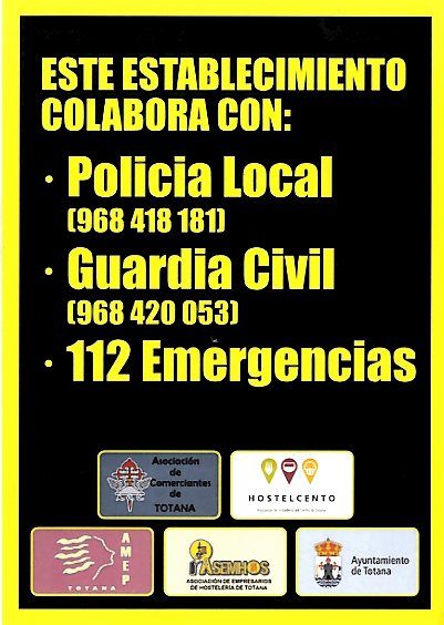 Los comercios y establecimientos hosteleros de Totana distribuirán adhesivos, en lugares visibles, con los números de teléfonos de los distintos Cuerpos y Fuerzas de Seguridad del Estado y Emergencias para facilitar su colaboración en materia de seguridad.