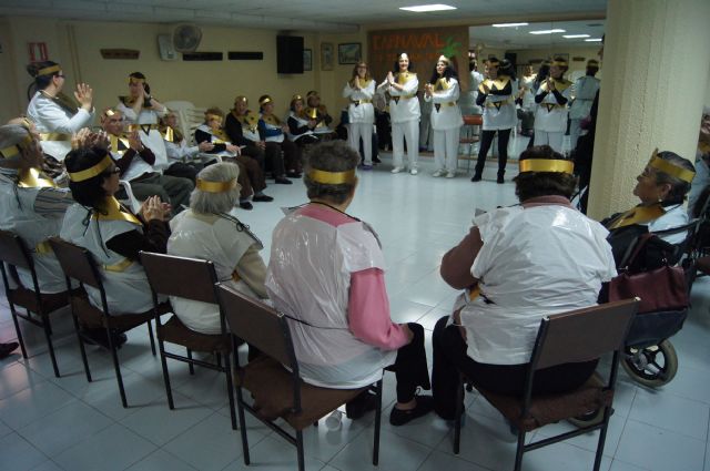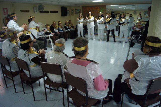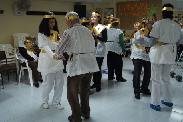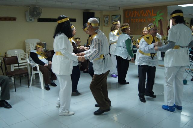 Usuarios de los servicios de Estancias Diurnas y de Estancias Diurnas de Alzheimer celebraron hoy en el Centro Municipal de Personas Mayores de la plaza Balsa Vieja de Totana una fiesta de Carnaval en el que se disfrazaron junto a los profesionales de ambos servicios.