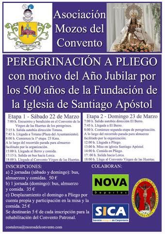 La Hermandad de Jesús en el Calvario y Santa Cena realizará los próximos días 22 y 23 de marzo una colaboración técnica con la Asociación de Mozos del Convento de Lorca en su peregrinación Jubilar a Pliego por los 500 años de la fundación de la Iglesia de Santiago Apóstol de esta localidad murciana.