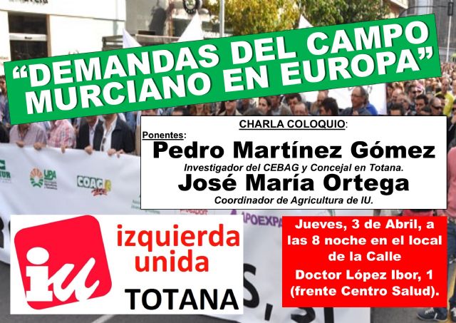 Organizada por la Agrupación Local de Izquierda Unida de Totana va a tener lugar en sus locales de la calle Doctor López Ibor, número 1, una charla-coloquio con el título "DEMANDAS DEL CAMPO MURCIANO EN EUROPA", a cargo Pedro Martínez Gómez, Ingeniero Agrícola, Investigador del Centro Superior de Investigaciones Científicas y Concejal de Izquierda Unida Verdes en el Ayuntamiento de Totana, que estará acompañado de José María Ortega, Coordinador del Area de Agricultura de IURM, así como Concejal de Izquierda Unida en Bullas y candidato al Parlamento Europeo en las próximas elecciones europeas de Mayo.