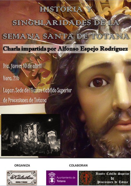 El jueves 10 de abril a las 21h tendrá lugar la charla “Historia y singularidades de la Semana Santa de Totana”, impartida por Alfonso Espejo Rodríguez, gran conocedor de nuestra Semana Santa, en la sede del Ilustre Cabildo Superior de Procesiones de Totana. Conoceremos desde los orígenes de las primeras manifestaciones públicas de la Semana Santa hasta la actualidad, haciendo hincapié en las singularidades que han llevado a la Semana Santa totanera a ser declarada de Interés Turístico Regional.