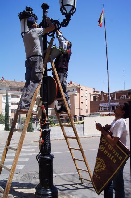 La Concejalía de Festejos y Cultura Popular ha instalado una treintena de banderolas ornamentales decorativas para engalanar las principales céntricas calles por donde transcurrirán los desfiles procesionales de la Semana Santa de Totana, en torno a la parroquia de Santiago El Mayor.