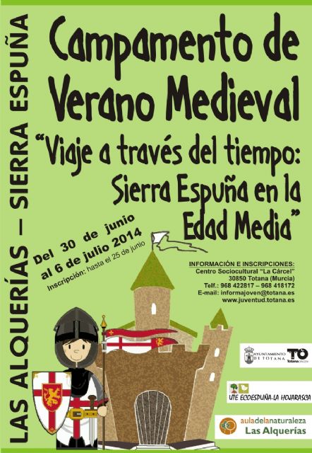 La Concejalía de Juventud informa de que ya se encuentra abierto el plazo de inscripción para el Campamento de Verano en "Las Alquerías", que este año se organiza ambientado en la Edad Media y que lleva por nombre "Viaje a través del tiempo: Sierra Espuña en la Edad Media".