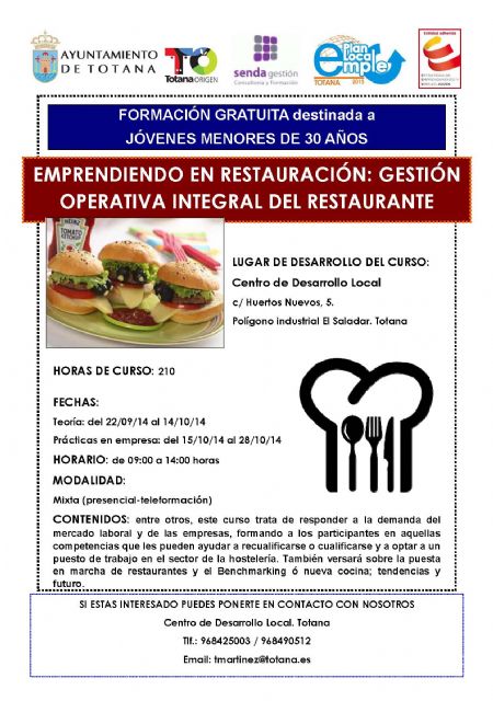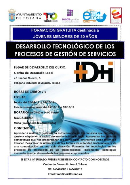 La Concejalía de Empleo del Ayuntamiento de Totana informa de que los cursos de formación, dirigidos a menores de 30 años, arrancarán el 22 de septiembre y no el 17 como se informó en primera instancia. Concretamente se llevarán a cabo dos acciones concretas uno dirigido a nuevos emprendedores o empresarios en activo que quieran aprovechar las ventajas operativas que ofrecen las nuevas tecnologías de la información para implementarlas en los negocios.