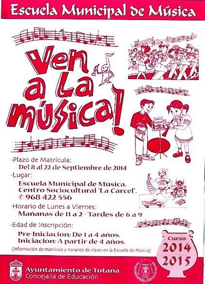 La Concejalía de Educación informa de que hoy finaliza el plazo Escuela de Música, dependiente de la Concejalía de Educación, que acogerá a más de 350 alumnos durante este curso 2014-2015. Los interesados han podido realizar su matrícula desde el pasado día 8 de septiembre, de lunes a viernes, de 11 a 14:00 horas y durante las tardes de 18:00 a 21:00 horas.